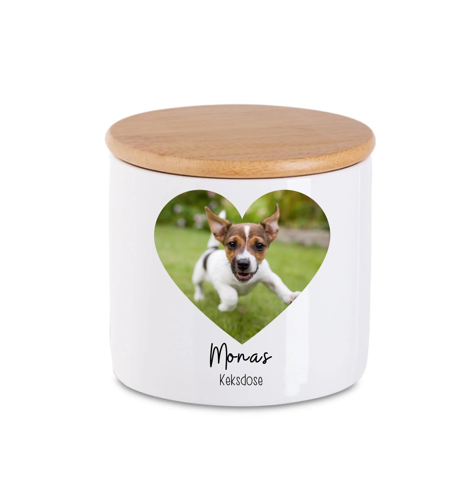 Stilvoll, hochwertig und mit Herz gestaltet: Unsere Vorratsdosen werden mit dem Namen und Foto deines Hundes bedruckt – für einen ganz persönlichen Platz für Lieblingssnacks.