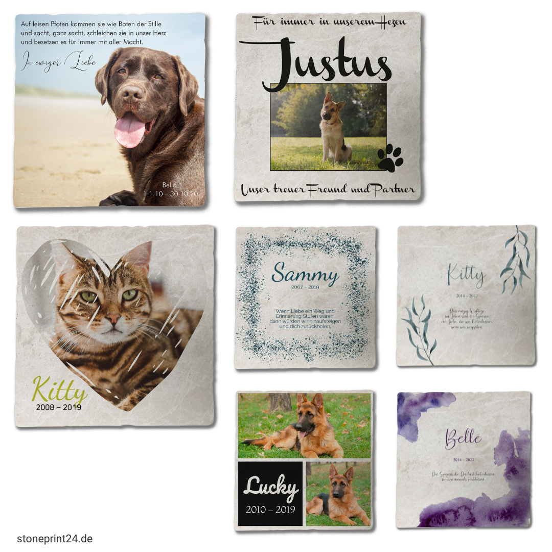 Wähle aus verschiedenen liebevoll gestalteten Designs, wahlweise mit Foto oder reinem Textmotiv. So entsteht ein ganz persönlicher Gedenkstein, der die Erinnerung an dein Haustier würdevoll bewahrt.